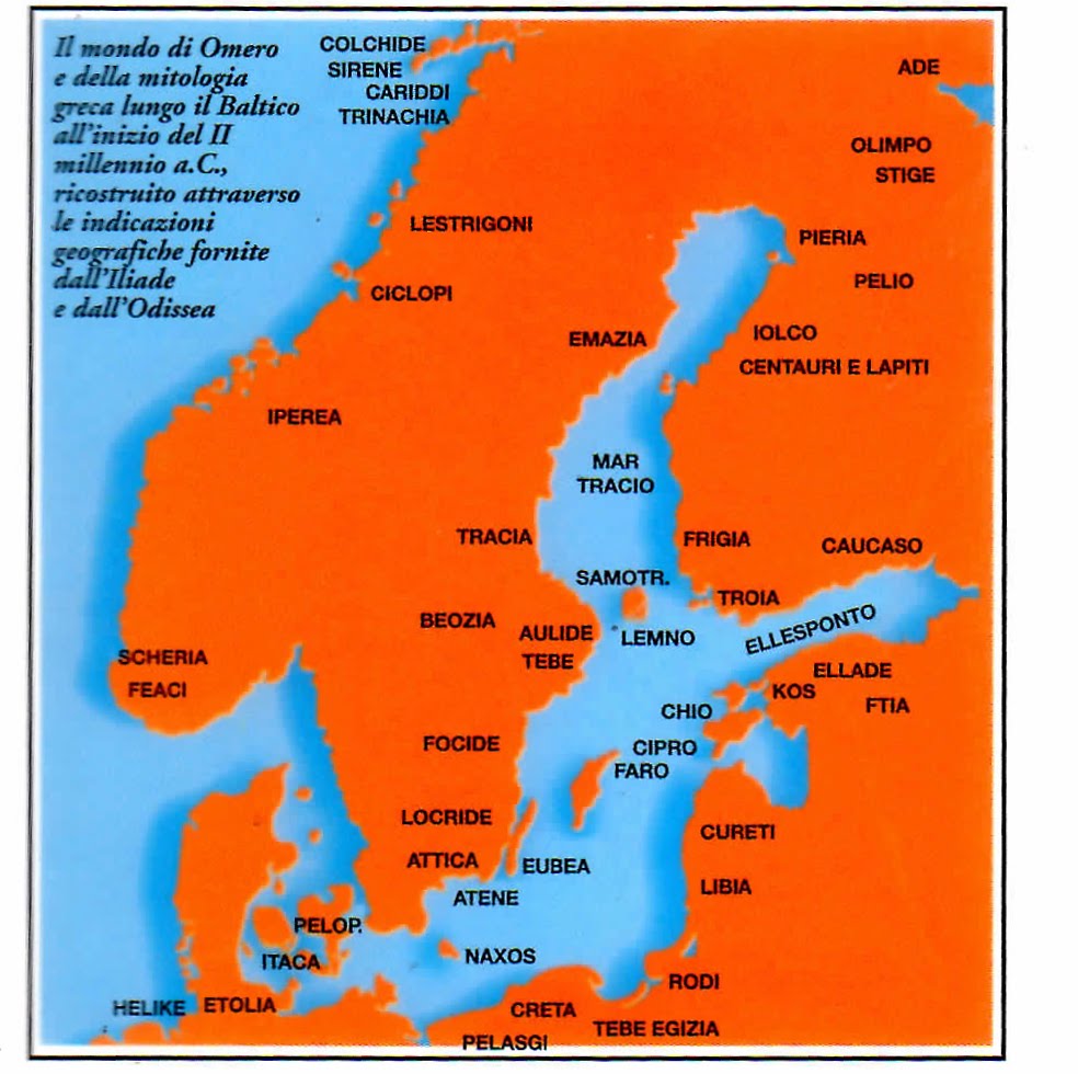 Questa cartina mostra come l’autore ci presenta il mondo omerico. Troia è collocata in Finlandia, di fronte al suo golfo: il largo Ellesponto. È interessante a questo proposito la testimonianza dello storico medievale Saxo Grammaticus, che cita il popolo degli Ellespontini come frequente nemico dei Danesi (quelli veri): se si fosse trattato dell’Ellesponto mediterraneo sarebbe stato alquanto scomodo per i Danesi condurvi frequenti spedizioni belliche – o viceversa.